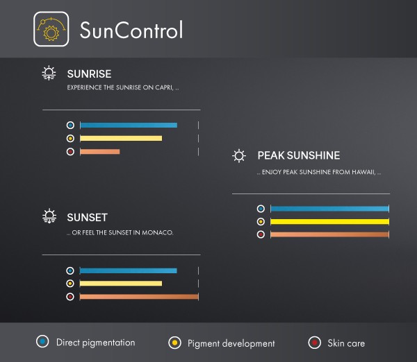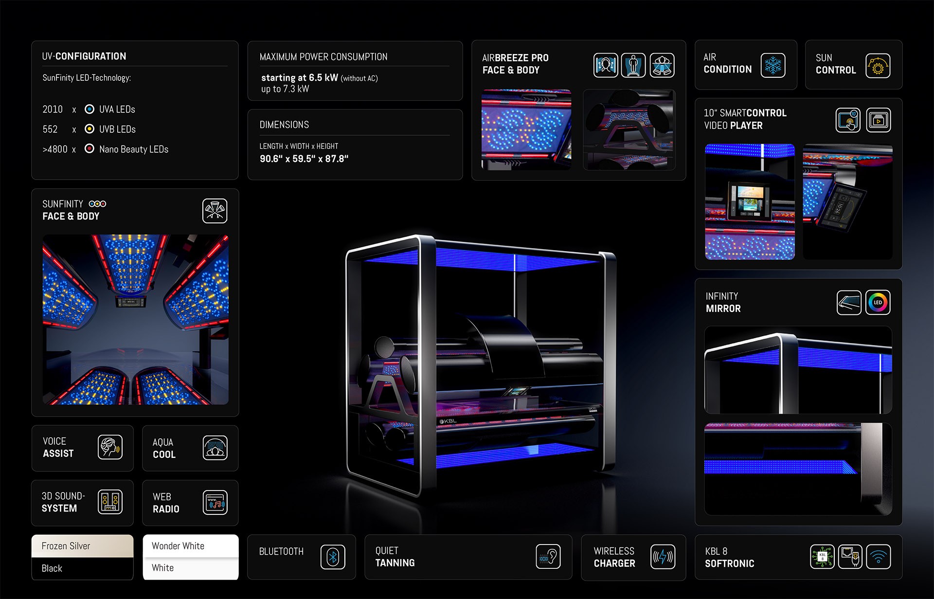 KBL has introduced an innovative feature called SunControl – the successor of the Intellisun system. While tanning on K11, customers can effortlessly adjust the position of the virtual sun in the sky simply by using their fingers on the screen. For those seeking enhanced pigmentation, an eastern sun option is available. At its zenith, the sun emits its rays at maximum power, while the sunset setting provides a soothing, warm light through the predominance of red LEDs. This inventive feature caters to a variety of customer needs and moods, making the tanning experience both beautiful and customizable.